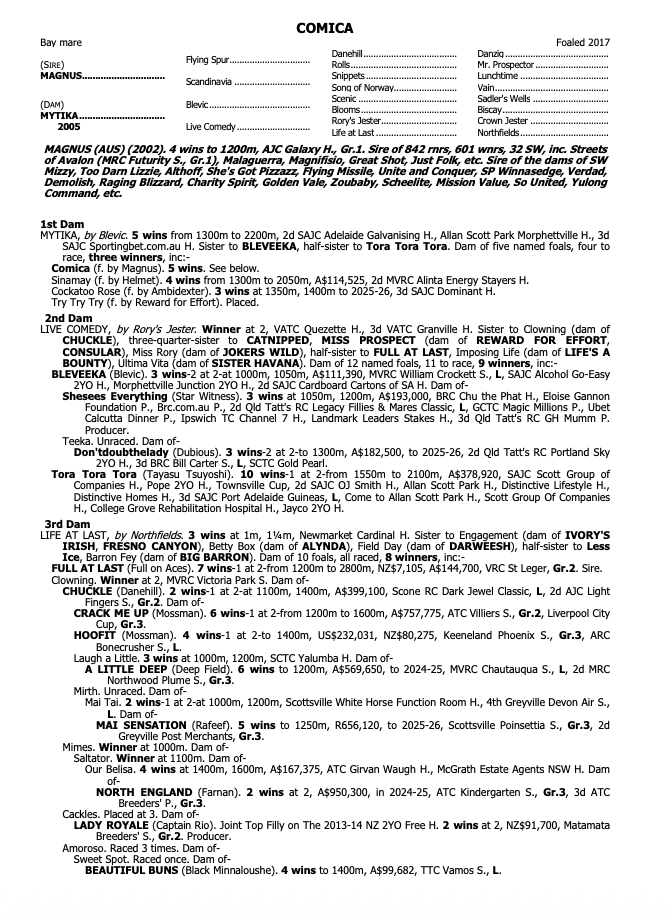 Comica (Magnus) - 5 wins from 1200m to 1600m accumulating A$413,775. Comica was an excellent race mare, she never reached her full potential with her career halted after a hoof injury sustained when she placed 3rd in the SAJC Queen of the South S., GROUP 2. She has since produced a TAGALOA filly (to be trained by M C Kent) and a filly by OLE KIRK 25’.