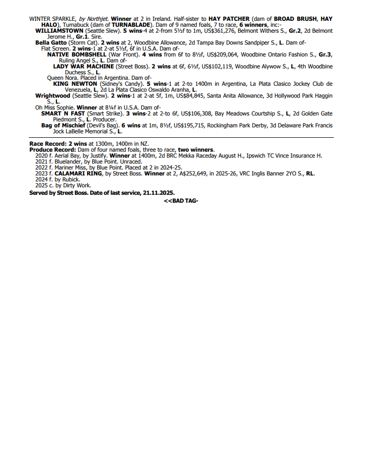 Excelsior island (Exceed and Excel) is the dam of CALAMARI RING (Street Boss) the recent 2025 Inglis Banner winner and a ½ sister to WARHORSE, a champion 2YO in NZ over 1200m - 1400m winning the Gr.1 ARC Diamond Stakes and the Gr.1 Manawatu Sires Produce Stakes.