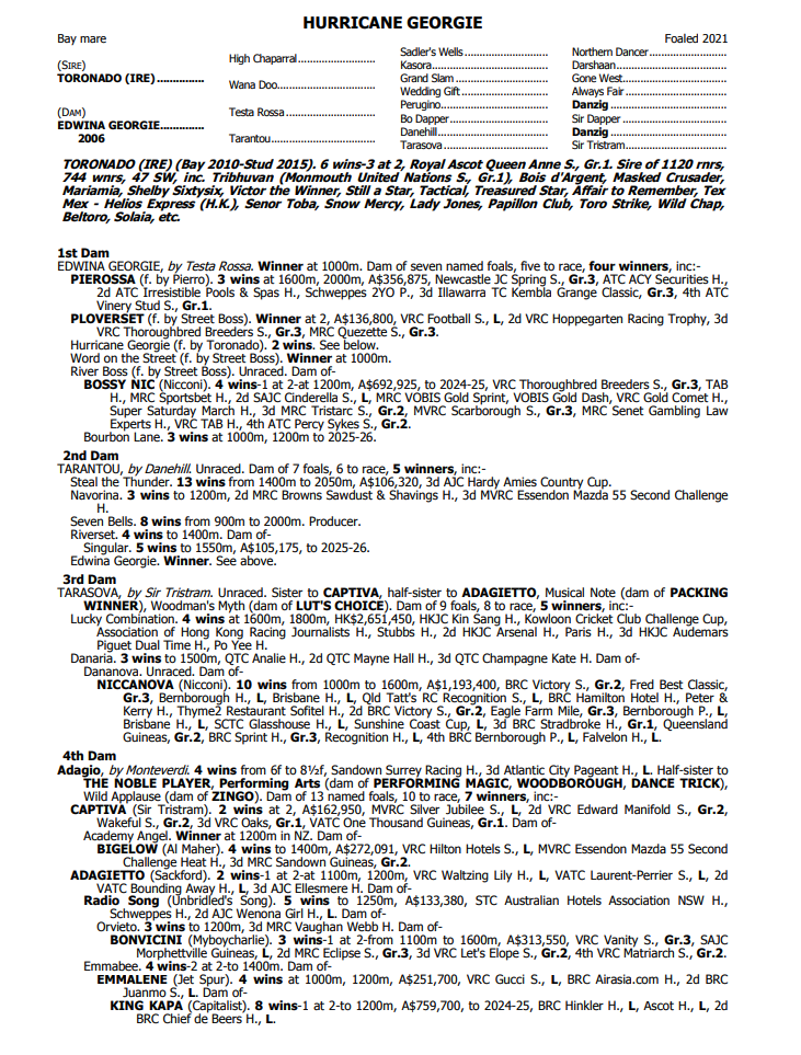 Hurricane Georgie (Toronado) a half sister to the Gr.3 winner and Gr.1 placed PIEROSSA and Gr.3 placegetter PLOVERSET. A competitor in black type races 3 times in SA, 9 starts 2 wins, 1 second, 1 third all at 3YO.